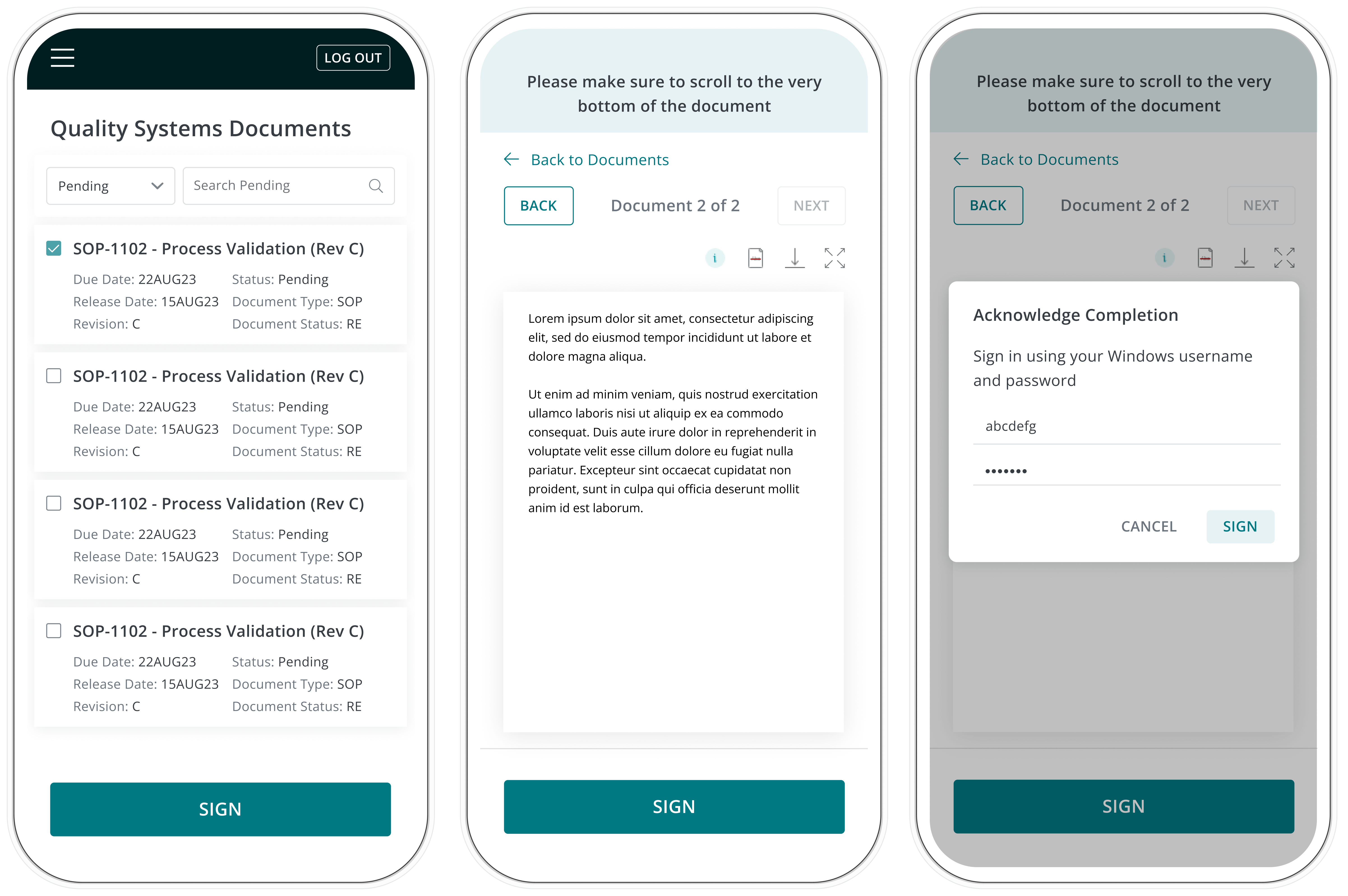 Users currently have to scroll horizontally while reading assigned documents. I redesigned these pages to fit both the document and its action buttons within the viewport, and added a reminder to scroll to the bottom of the document to enable the “Sign” button.